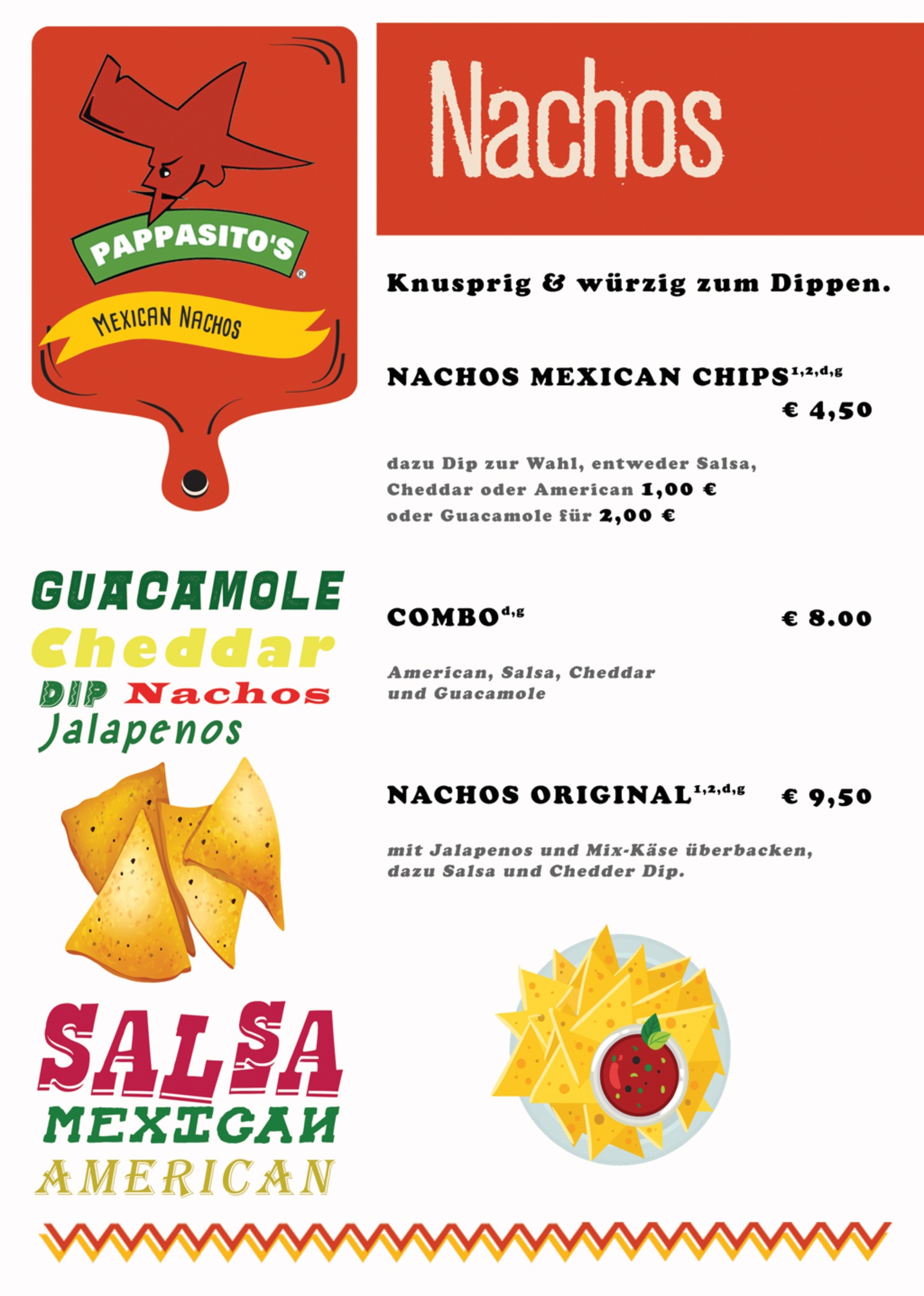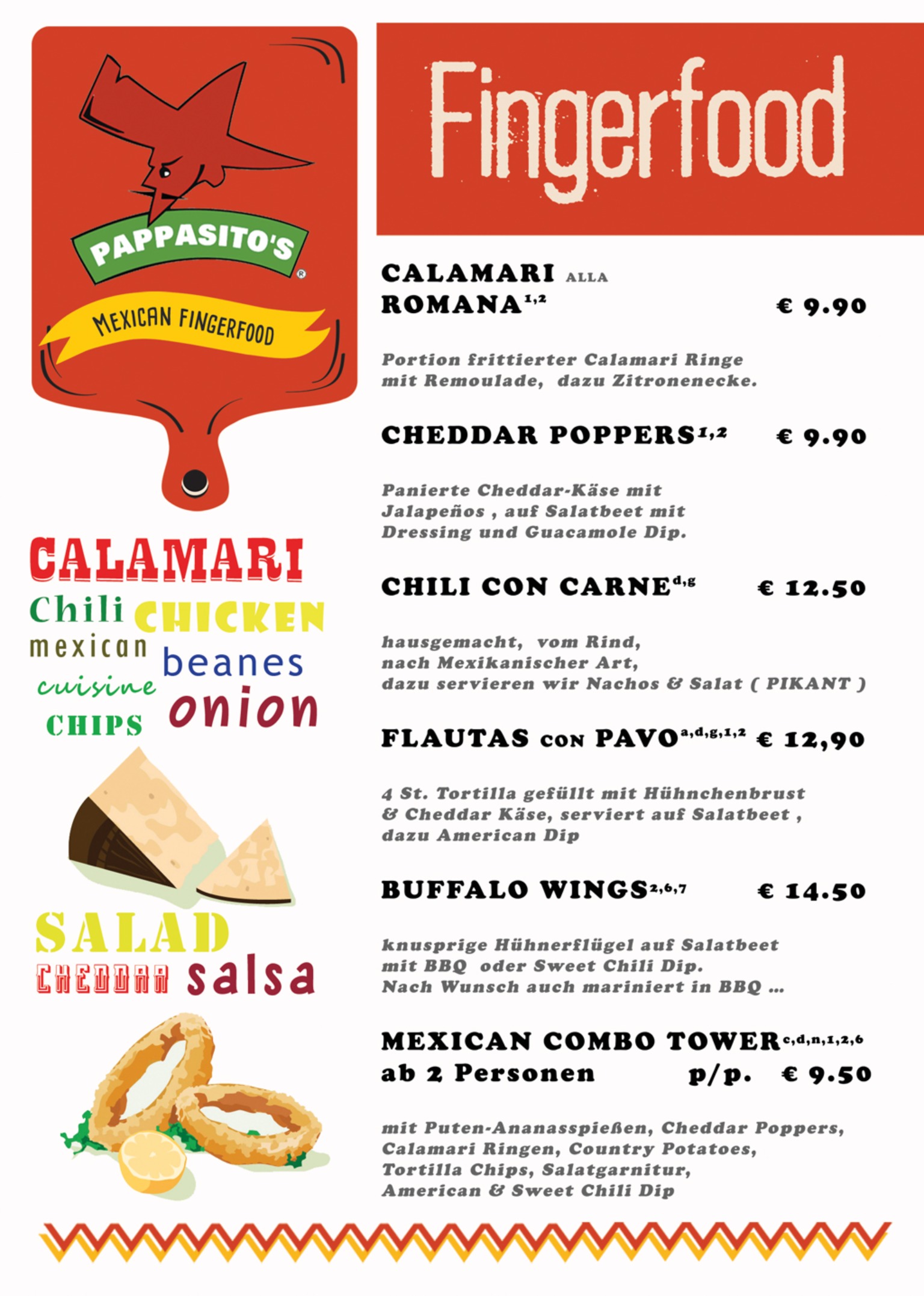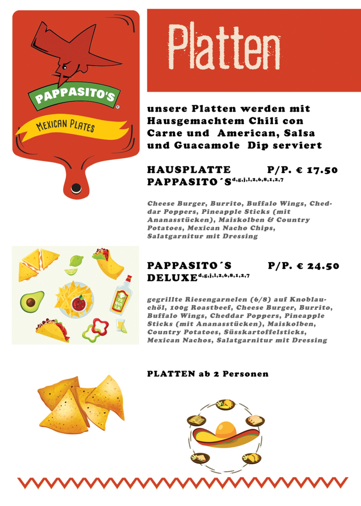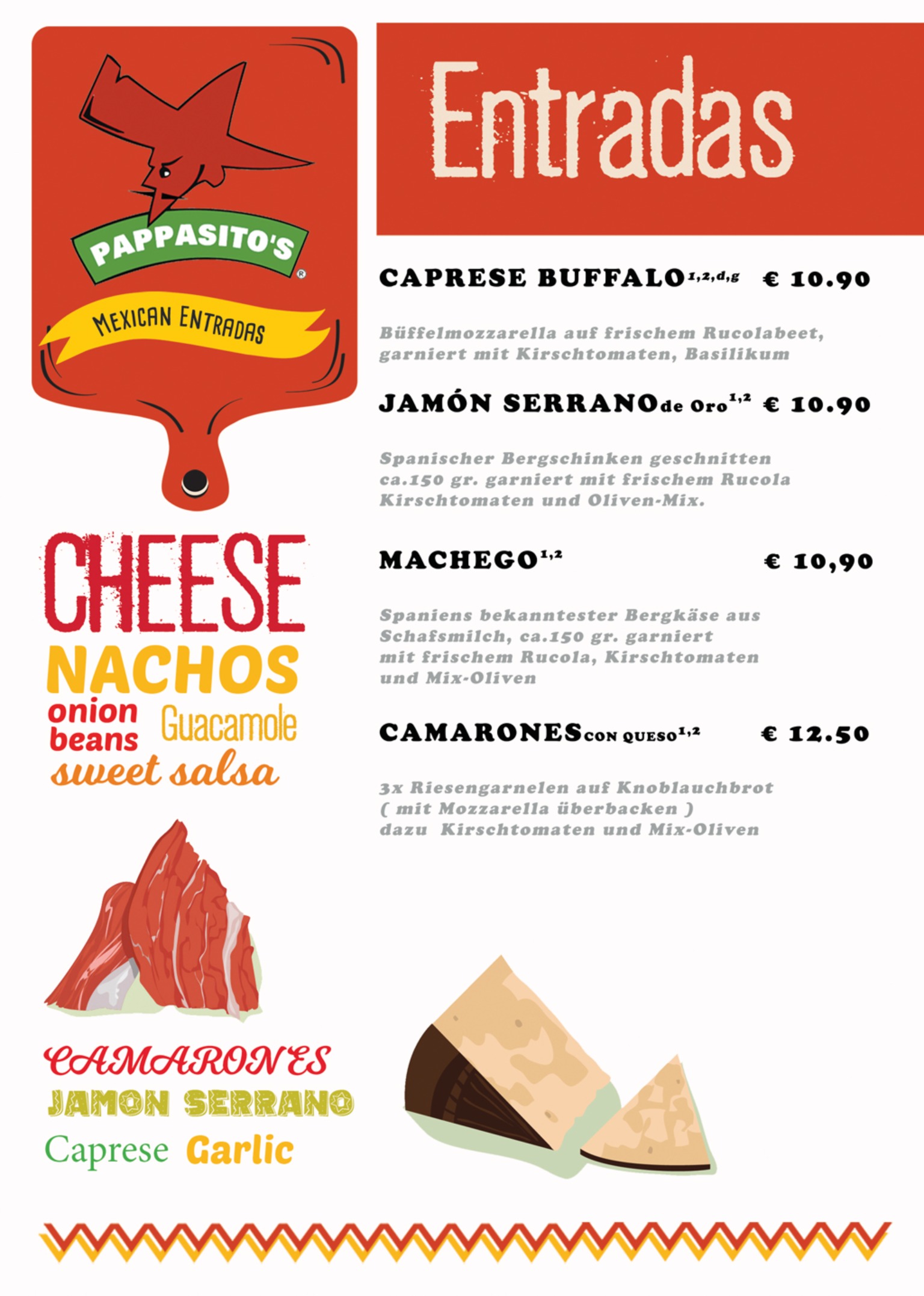 Caprese Buffalo, Jamon Serano de Ore, Machego, Camarones con queso, Nachos Mexican Chips, Combo, Nachos Original, Vegetariana, Asadero, El Chico, El Paso, Pappasitos, El Chica, Grandioso, Calamari Romana, Cheddar Poppers, Chili Con Carne, Flautas con Carne, Flautas con Pavo, Buffalo Wings, Mexican Combo Tower, Papata Americana, Patata Chili, Vegeteriana, Patata Pollo, Patata Burro, La Vegetariana, La Tropicana, La Mexicaner, Del Burro, Del Pollo, Del Burro, Combinados, Tortilla, Chilli Con Carne, Shrimps, Con Pavo, De Res, Steak El Gaucho, Rinderfilet Pappasitos, Nutella Crepes, Schokosouffle, Apfelkücherl,