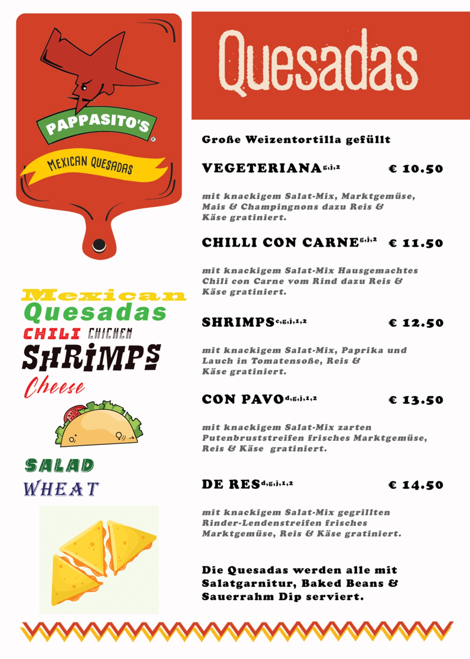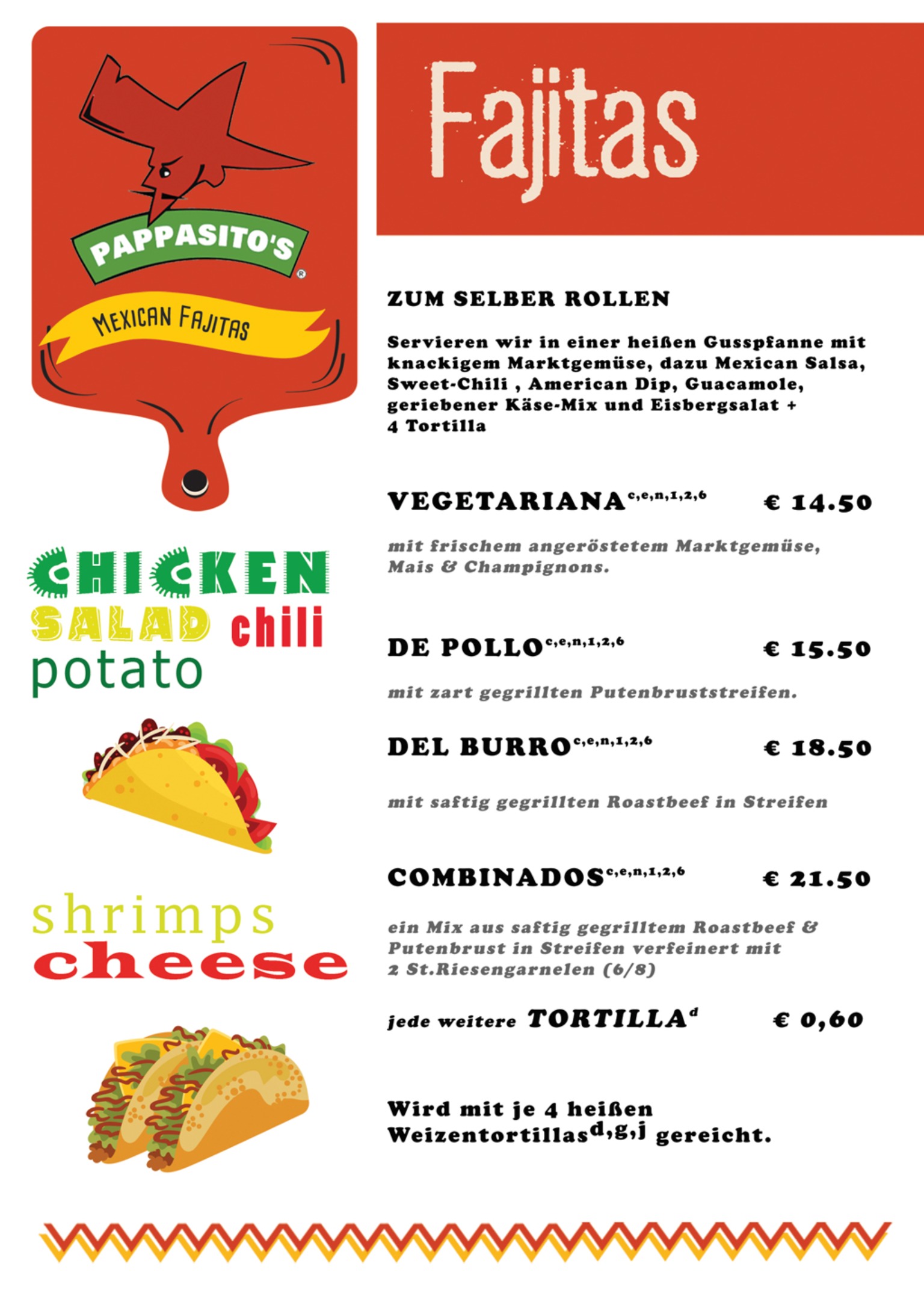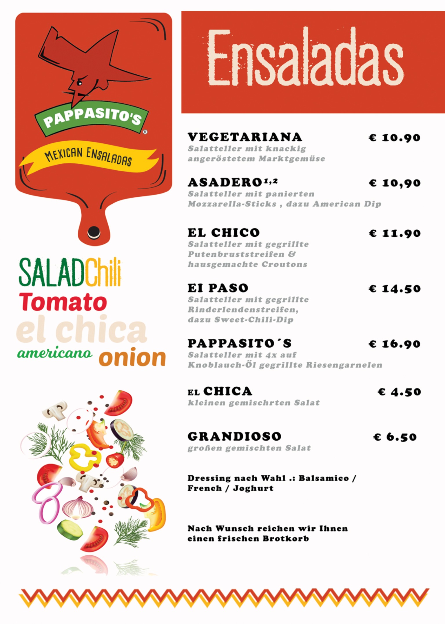 Caprese Buffalo, Jamon Serano de Ore, Machego, Camarones con queso, Nachos Mexican Chips, Combo, Nachos Original, Vegetariana, Asadero, El Chico, El Paso, Pappasitos, El Chica, Grandioso, Calamari Romana, Cheddar Poppers, Chili Con Carne, Flautas con Carne, Flautas con Pavo, Buffalo Wings, Mexican Combo Tower, Papata Americana, Patata Chili, Vegeteriana, Patata Pollo, Patata Burro, La Vegetariana, La Tropicana, La Mexicaner, Del Burro, Del Pollo, Del Burro, Combinados, Tortilla, Chilli Con Carne, Shrimps, Con Pavo, De Res, Steak El Gaucho, Rinderfilet Pappasitos, Nutella Crepes, Schokosouffle, Apfelkücherl,