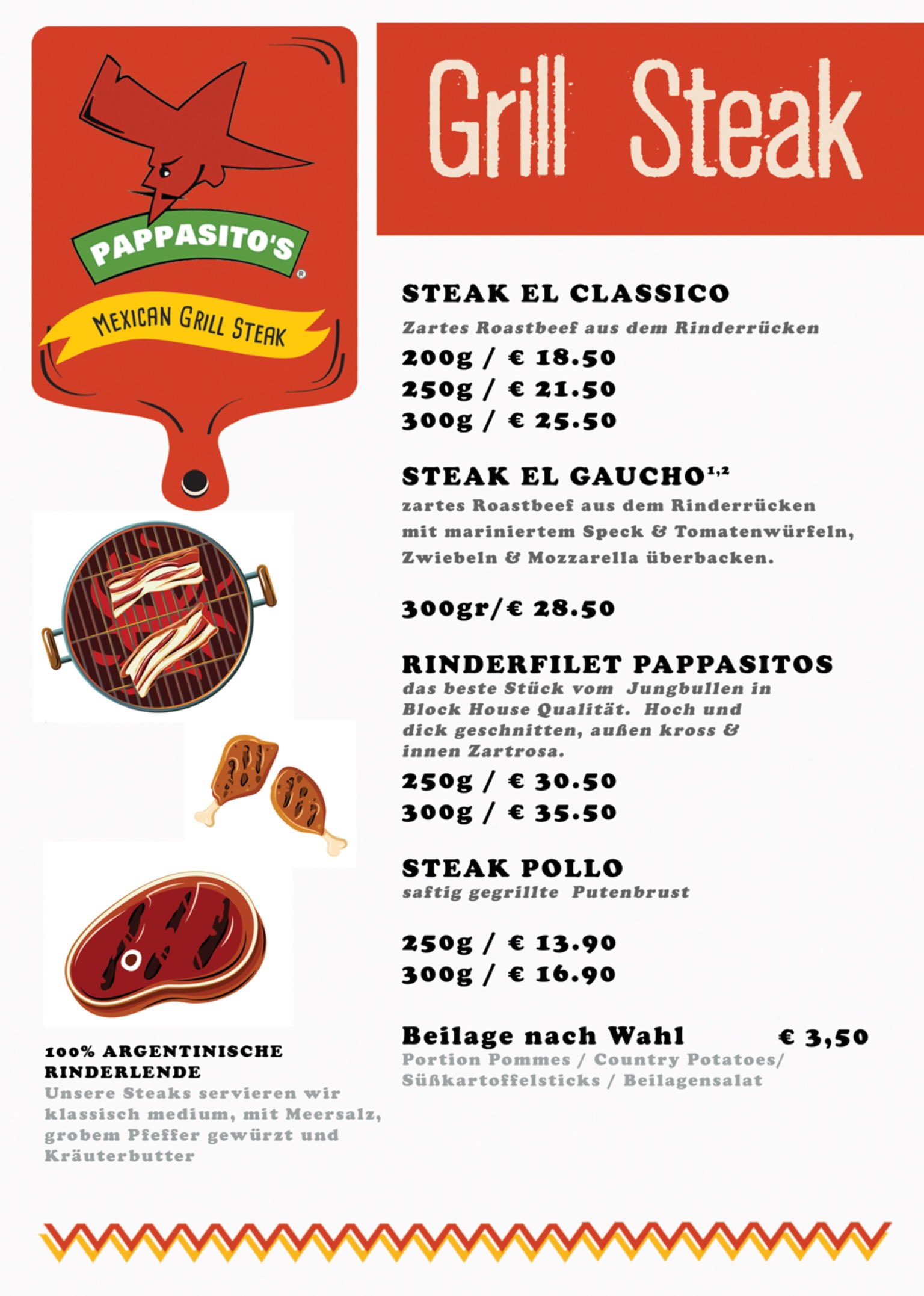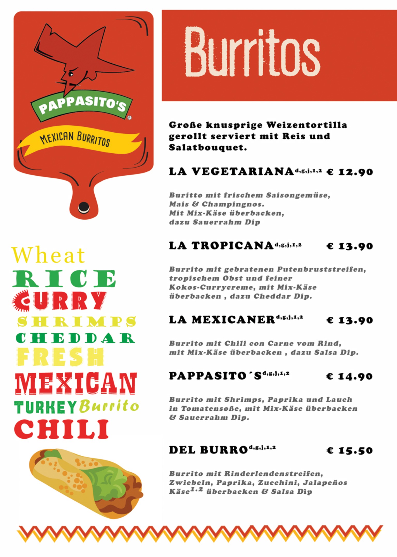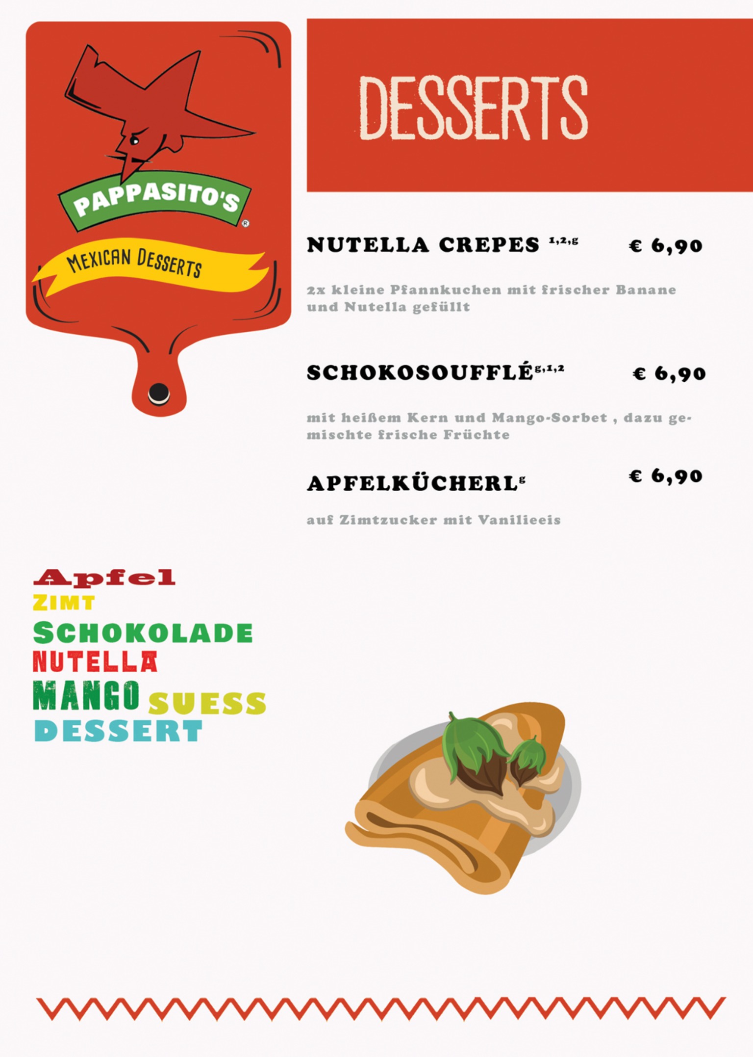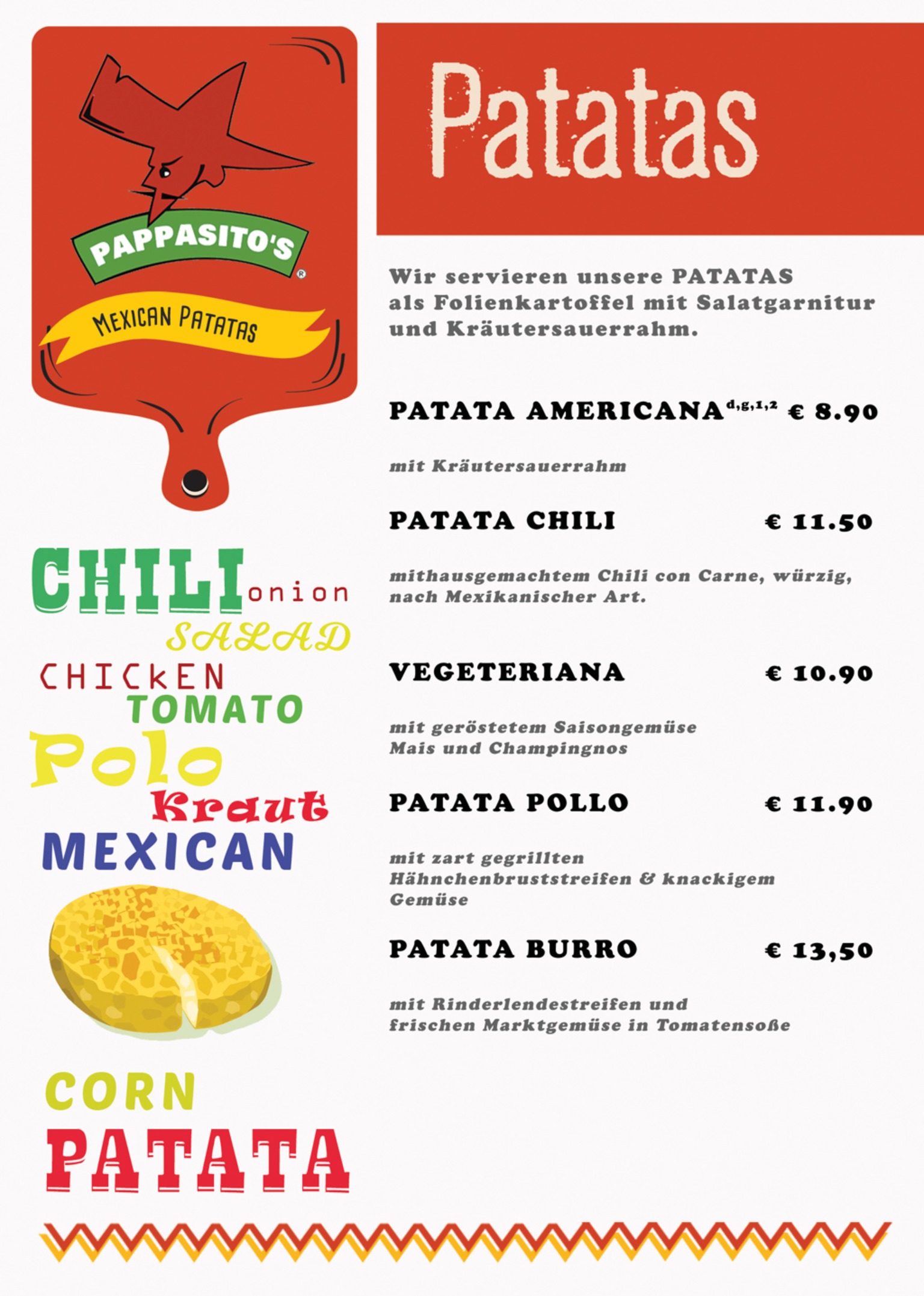 Caprese Buffalo, Jamon Serano de Ore, Machego, Camarones con queso, Nachos Mexican Chips, Combo, Nachos Original, Vegetariana, Asadero, El Chico, El Paso, Pappasitos, El Chica, Grandioso, Calamari Romana, Cheddar Poppers, Chili Con Carne, Flautas con Carne, Flautas con Pavo, Buffalo Wings, Mexican Combo Tower, Papata Americana, Patata Chili, Vegeteriana, Patata Pollo, Patata Burro, La Vegetariana, La Tropicana, La Mexicaner, Del Burro, Del Pollo, Del Burro, Combinados, Tortilla, Chilli Con Carne, Shrimps, Con Pavo, De Res, Steak El Gaucho, Rinderfilet Pappasitos, Nutella Crepes, Schokosouffle, Apfelkücherl,
